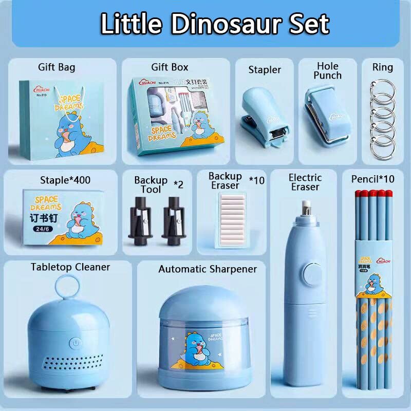 📝【Rich Set】The Stationery set includes Electric Automatic Pencil Sharpener, Electric Eraser with 10 Erasers, Desktop Vacuum Cleaner,Stapler , Hole Puncher,A Complete Kit for you Child